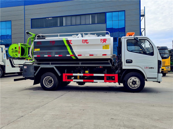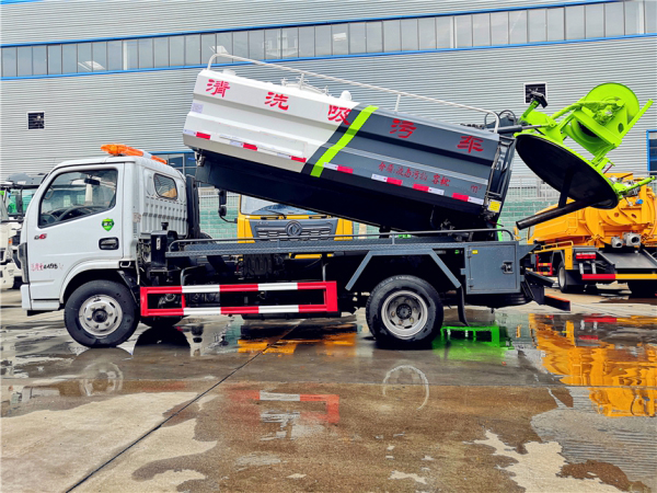 吸污部分:3.8方污罐,罐體5mmQ235優質碳鋼,配淄博SK-9水循環泵,8米吸污管一根,進氣管加過濾網,防溢閥加高,后蓋卡扣鎖緊,前視污亮管,后尾部加裝1個力拓牌**mm的球閥均帶出口,罐體帶舉升功能,后門帶液壓開啟。